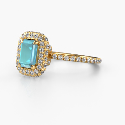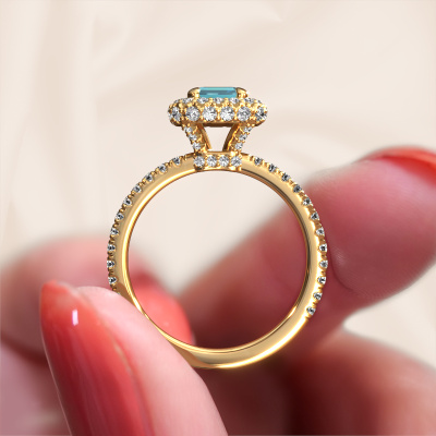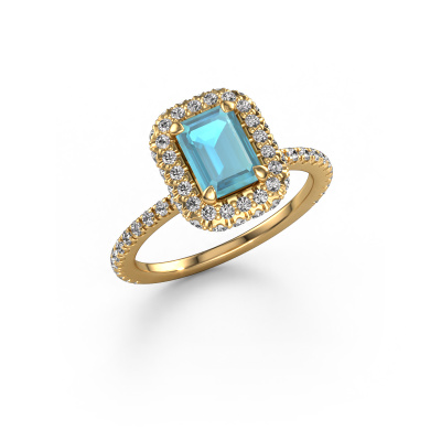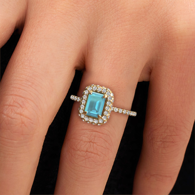 The ring shown above is called the Talitha EME. We call this type of ring a halo ring because it has one center gemstone and a band that is also pave set with gemstones. The 14 Carat gold engagement ring is set with a emerald cut 7x5 mm blue topaz center stone and the band is pave set with lab grown diamonds. What makes this luxury gold halo ring special are the smaller sized stones embracing the center stone. This gorgeous engagement ring is called a halo ring because the smaller gemstones give the center stone a halo of surrounding light. In order for the smaller stones to enhance the center stone, they have to be placed so there is no interference of light. And that's when our expert goldsmiths come in. Each individual stone is carefully set in the ring by hand. During manufacturing, light fall is constantly monitored to make sure the special halo is still visible. In the end you get a unique engagement ring, with a blue topaz of your choosing at its centre. You can imagine the effect of a ring of such significance when you give it to her on her special day to shine. By using our modern techniques, we can design and customize the finest quality jewels with the utmost care for you. Our engagement rings are always priced 30 percent lower than other jewelers. We make engagement rings to order so we don't have to maintain a large stock. If you have a certain budget, we are more than happy to advice you accordingly.Our team adds new designs to our online collection daily. Our designers and goldsmiths work together in creating the best design. We strive to offer a diverse collection of jewels. Perhaps you have a specific jewel design in mind. One you came across somewhere. Please contact us for a free consultation. We will make you an offer, based on a fair price/ quality ratio, that will baffle you.To make it easier for you, we offer a 30 day return policy. Check our terms and conditions.