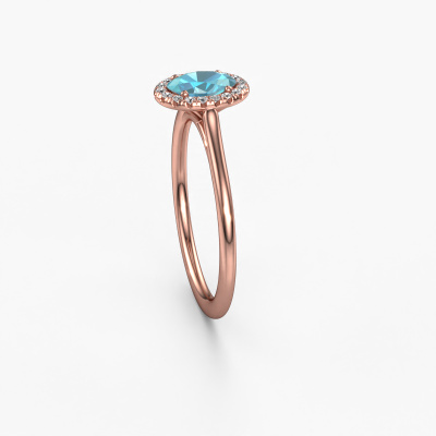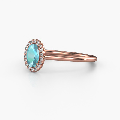 The ring shown above is called the Seline ovl 1. We call this type of ring a halo ring because it has one center gemstone and a band that is also pave set with gemstones. The 14 Carat rose gold engagement ring is set with a oval 6x4 mm blue topaz center stone and the band is pave set with diamonds. What makes this classic rose gold halo ring special are the smaller sized stones embracing the center stone. This gorgeous engagement ring is called a halo ring because the smaller gemstones give the center stone a halo of surrounding light. In order for the smaller stones to enhance the center stone, they have to be placed so there is no interference of light. And that's when our expert goldsmiths come in. Each individual stone is carefully set in the ring by hand. During manufacturing, light fall is constantly monitored to make sure the special halo is still visible. In the end you get a unique engagement ring, with a blue topaz of your choosing at its centre. You can imagine the effect of a ring of such significance when you give it to her on her special day to shine. Are you on a budget? Please feel free to contact us, so we can go discuss your options. We offer our engagement rings at guaranteed best price, because we make them to order. You won't find such a price anywhere else!Our team adds new designs to our online collection daily. Our designers and goldsmiths work together in creating the best design. We strive to offer a diverse collection of jewels. Perhaps you have a specific jewel design in mind. One you came across somewhere. Please contact us for a free consultation. We will make you an offer, based on a fair price/ quality ratio, that will baffle you.To make it easier for you, we offer a 30 day return policy. Check our terms and conditions.