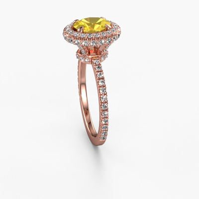The ring shown above is called the Talitha OVL. We call this type of ring a halo ring because it has one center gemstone and a band that is also pave set with gemstones. The 14 Carat rose gold engagement ring is set with a oval 7x5 mm yellow sapphire center stone and the band is pave set with lab grown diamonds. What makes this classic rose gold halo ring special are the smaller sized stones embracing the center stone. This gorgeous engagement ring is called a halo ring because the smaller gemstones give the center stone a halo of surrounding light. In order for the smaller stones to enhance the center stone, they have to be placed so there is no interference of light. And that's when our expert goldsmiths come in. Each individual stone is carefully set in the ring by hand. During manufacturing, light fall is constantly monitored to make sure the special halo is still visible. In the end you get a unique engagement ring, with a yellow sapphire of your choosing at its centre. You can imagine the effect of a ring of such significance when you give it to her on her special day to shine. By using a combination of the latest modern techniques, combined with ancient crafting, we can make all our engagement rings in our own studio. Each jewel is made to order. This is advantageous because we can offer you a price you won't find anywhere else.Our designers and goldsmiths work together each day, creating new jewels. Perhaps you have found a nice classic engagement ring somewhere, which can be used to customize your unique ring. Please feel free to contact us. We will make you an offer, based on a fair price/ quality ratio, which will amaze you.To make it easier for you, we offer a 30 day return policy. Check our terms and conditions.