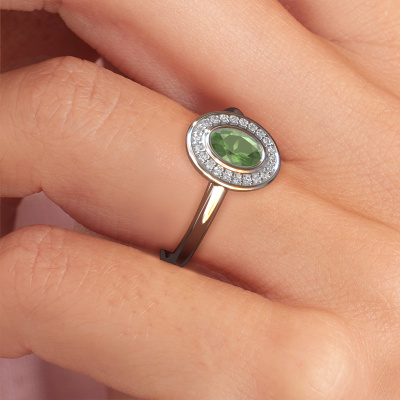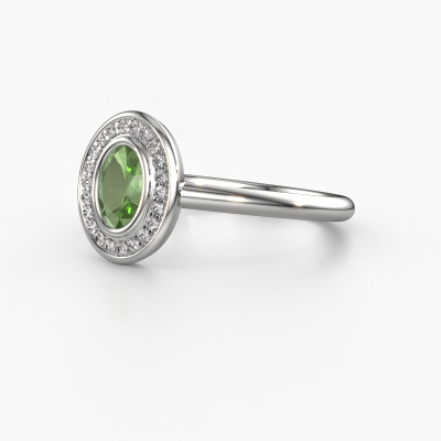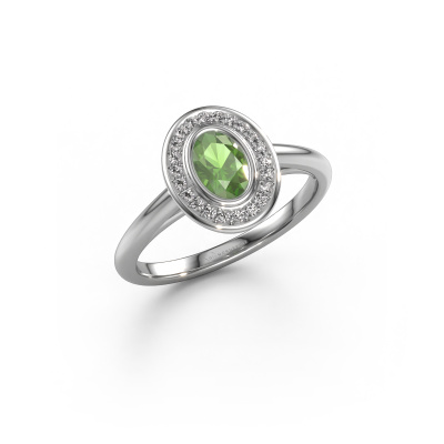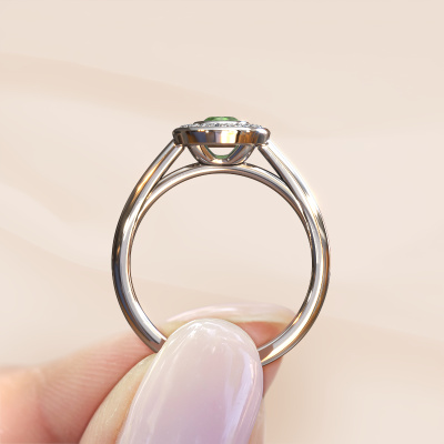 The ring shown above is called the Noud 1 OVL. We call this type of ring a halo ring because it has one center gemstone and a band that is also pave set with gemstones. The platinum engagement ring is set with a oval 6x4 mm tourmaline green center stone and the band is pave set with lab grown diamonds. What makes this classic platinum halo ring special are the smaller sized stones embracing the center stone. This gorgeous engagement ring is called a halo ring because the smaller gemstones give the center stone a halo of surrounding light. In order for the smaller stones to enhance the center stone, they have to be placed so there is no interference of light. And that's when our expert goldsmiths come in. Each individual stone is carefully set in the ring by hand. During manufacturing, light fall is constantly monitored to make sure the special halo is still visible. In the end you get a unique engagement ring, with a tourmaline green of your choosing at its centre. You can imagine the effect of a ring of such significance when you give it to her on her special day to shine. By using a combination of the latest modern techniques, combined with ancient crafting, we can make all our engagement rings in our own studio. Each jewel is made to order. This is advantageous because we can offer you a price you won't find anywhere else.Our team adds new designs to our online collection daily. Our designers and goldsmiths work together in creating the best design. We strive to offer a diverse collection of jewels. Perhaps you have a specific jewel design in mind. One you came across somewhere. Please contact us for a free consultation. We will make you an offer, based on a fair price/ quality ratio, that will baffle you.To make it easier for you, we offer a 30 day return policy. Check our terms and conditions.