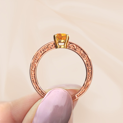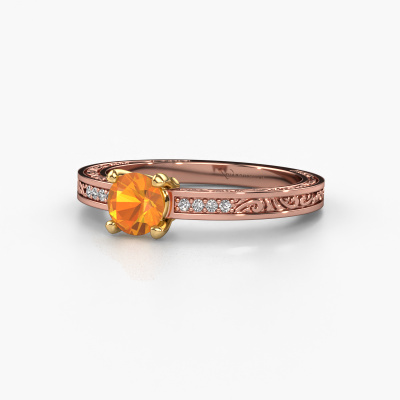 This 14 Carat rose gold ring is called Claudette 2 and is set with 5 mm citrin. Is your girlfriend hooked on vintage? Then this rose gold filigree engagement ring will surely match her style perfectly. A trendy ring with just a hint of Celtic adornment. A truly stunning, romantic design! Especially when you customize your ring to your own liking. This Celtic pavé solitaire engagement ring is set with stunning citrin. As you can see, you are the boss in selecting a gemstone which matches the style of your girlfriend best. Each gemstone is carefully selected by our merchants whom are spread throughout the world. Nothing but the best gems for our expert goldsmith. After all, it is his crowning glory! Each jewel is made just for you by our master goldsmiths in our own studio.After receiving your order, our goldsmiths will start the creative process of making your Claudette 2 engagement ring. We don't keep stock. This is advantageous because these costs will not be passed on to you. Therefore, we can offer jewelry at exceptionally low prices.Do you have a specific ring in mind? One you came across somewhere. Please feel free to tell us your wishes and we will turn your design into a unique engagement ring. You can follow the development of your ring design because we use 3D drawings. This gives you a realistic preview of your design. We will gladly send you a non-binding offer, based on a fair price/ quality ratio. It will amaze you.To make it easier for you, we offer a 30 day return policy. Check our terms and conditions.