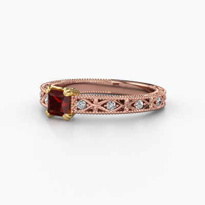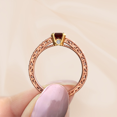 This 14 Carat rose gold ring is called Ardella and is set with 4 mm garnet. An extraordinary rose gold vintage ring. One that will surely make the love of your life shine like a diamond! That is what we hope to achieve. This vintage engagement ring is set with exquisite garnet. Whichever gemstone you choose from our selection, is up to you. The gemstone is selected with great care because we believe your filigree engagement ring must be adorned with nothing but the most beautiful gemstone. Wouldn't you agree? Our expert goldsmith will design your ring in our own crafting studio, where the garnet will be set with great precision. The ring will then be polished till it shines perfectly. Nothing but the best for the love of your life! This jewel is made just for you by our master goldsmiths in our own studio.After receiving your order, our goldsmiths will passionately start the creative process of making your engagement ring in our own studio. Because we don't have a big stockpile, these costs will not be passed on to you. Our pricing is proof of that! We offer top quality jewels at lowest price, guaranteed.Different styles of new rings are made daily by our team. Perhaps you have found a pavé solitaire engagement ring somewhere. One you would like to give to your loved one. Please feel free to share your thoughts and design with our jewel designers. We would love to turn your design into a vintage engagement ring. You can follow the development of your ring design because we use very detailed 3D drawings. On top of that, you can order a dummy of the design. A dummy is a plastic ring, which can be shaped according your ring design. You can try it on and check if the engagement ring is up to standard. We will gladly send you a non-binding offer, based on a fair price/ quality ratio. The offer will baffle you, considering the quality of the ring and gemstones.To make it easier for you, we offer a 30 day return policy. Check our terms and conditions.