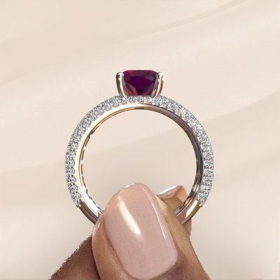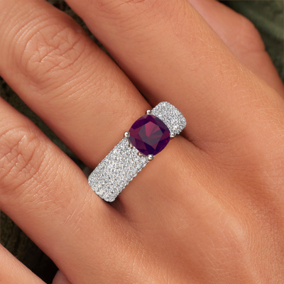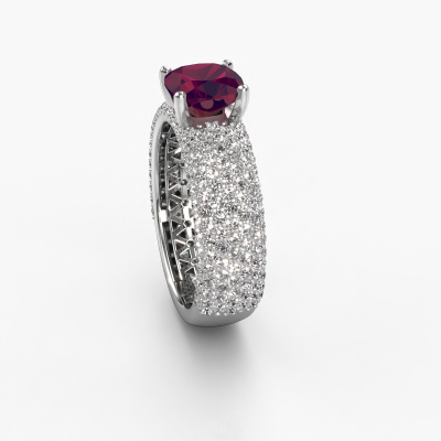 This platinum ring is called Darcy and is set with 7 mm rhodolite. This exclusive platinum pavé solitaire Engagement ring is a true work of art! The ornaments are crafted with a lot of patience and great passion. In order to create this ring with great precision, this craft requires a keen eye and skillful hand. A challenge which ignites a fire in our expert goldsmith. The exquisite rhodolite are set in a special way so they stand out even more. This gives the ring an even more glamorous appearance. The pavé Engagement ring is actually unique on its own because of the gemstones which we carefully select especially for this ring. On top of that you select the precious metals which will be used to create a unique ring for the most extraordinary woman in your life! This jewel is unique in every way! Simply customize to your likingBecause we design and deliver our own rings, we can offer you a Engagement ring at a price you won't find anywhere else. A ring is made to order, which helps prevent excess supplies, so we can make you a great price offer. We understand it feels risky, buying your Engagement ring online, but we will gladly assist in the designing process, taking your budget into consideration.Different styles of new rings are made daily by our team. Perhaps you have found a pavé solitaire Engagement ring somewhere. One you would like to give to your loved one. Please feel free to share your thoughts and design with our jewel designers. We would love to turn your design into a exclusive Engagement ring. You can follow the development of your ring design because we use very detailed 3D drawings. On top of that, you can order a dummy of the design. A dummy is a plastic ring, which can be shaped according your ring design. You can try it on and check if the Engagement ring is up to standard. We will gladly send you a non-binding offer, based on a fair price/ quality ratio. The offer will baffle you, considering the quality of the ring and gemstones.To make it easier for you, we offer a 30 day return policy. Check our terms and conditions.