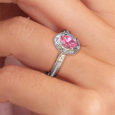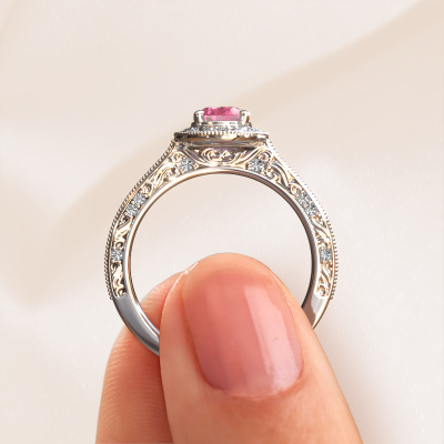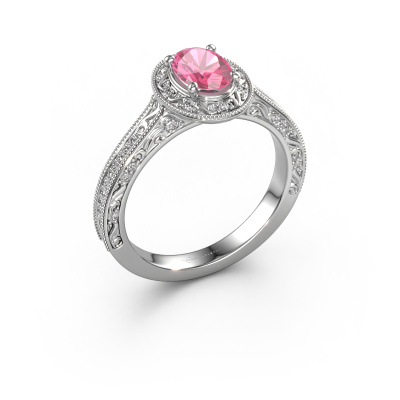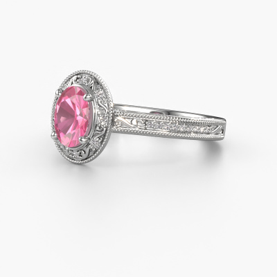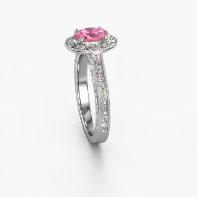 This platinum ring is called Alice OVL and is set with 7x5 mm pink sapphire. What is it that makes your relationship unique? What is it about her that makes you want to bend down on one knee? The unique bond between the two of you is emphasized by an equally unique ring. A one of a kind filigree halo engagement ring made especially for her. That is why this vintage ring fits her like a glove. Each specific detail of this filigree platinum pink sapphire set engagement ring is hand-picked, crafted and polished by our expert goldsmith. The result is an exquisite ring, unique and perfectly crafted to perfection. That is what our expert Goldsmiths strive for. This jewel is made with passion and love by one of our master goldsmiths.By using our modern techniques, we can design and customize the finest quality jewels with the utmost care for you. Our engagement rings are always priced 30 percent lower than other jewelers. We make engagement rings to order so we don't have to maintain a large stock. If you have a certain budget, we are more than happy to advice you accordingly.Our team adds new designs to our online collection daily. Our designers and goldsmiths work together in creating the best design. We strive to offer a diverse collection of jewels. Perhaps you have a specific jewel design in mind. One you came across somewhere. Please contact us for a free consultation. We will make you an offer, based on a fair price/ quality ratio, that will baffle you.To make it easier for you, we offer a 30 day return policy. Check our terms and conditions.