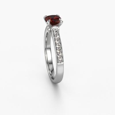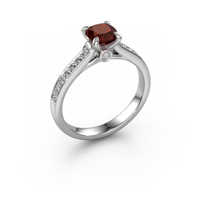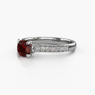 The ring shown above is called the Valorie cus 2. We call this type of ring a pavé solitaire ring because it has one center gemstone and a band that is also pave set with gemstones. The platinum engagement ring is set with a cushion 5.5 mm garnet center stone and the band is pave set with diamond gemstones. Each jewel is made just for you by our master goldsmiths in our own studio.This traditional platinum pavé solitaire engagement ring has an exquisite cushion garnet center stone. To further accentuate the center stone, the band is fully set with more diamonds. Its open prong setting allows light to strike the garnet from various angles and this adds sparkle to your garnet ring. The photo shown above depicts the goldsmith's carefully handcrafted details of the ring. The high positioning of the center stone is truly eye-catching. The perfect engagement ring for the crown jewel of your life! By using a combination of the latest modern techniques, combined with ancient crafting, we can make all our engagement rings in our own studio. Each jewel is made to order. This is advantageous because we can offer you a price you won't find anywhere else.Our designers and goldsmiths work together each day, creating new jewels. Perhaps you have found a nice traditional engagement ring somewhere, which can be used to customize your unique ring. Please feel free to contact us. We will make you an offer, based on a fair price/ quality ratio, which will amaze you.To make it easier for you, we offer a 30 day return policy. Check our terms and conditions.