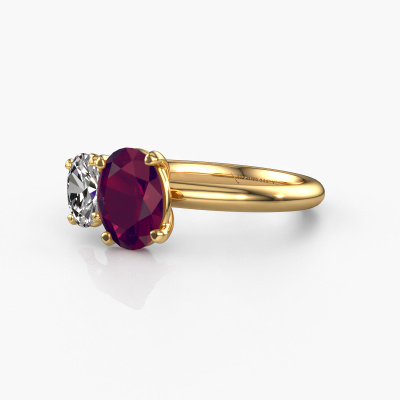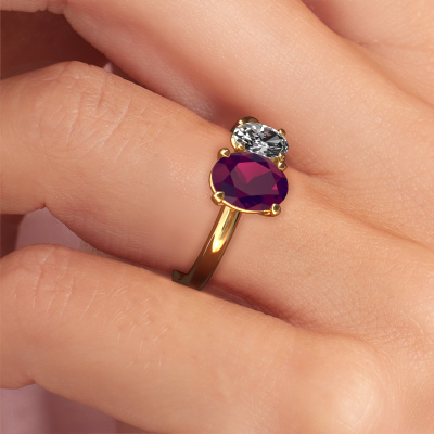 This 14 Carat gold ring is called Toi et Moi OVL-OVL and is set with rhodolite. How would you describe the style of the love of your life? Does she have a unique sense of style? This stunning sublime gold engagement ring can be custom made to your own or her liking. Our rhodolite gemstones have been carefully selected because we believe your modern engagement ring must be adorned with nothing but the most beautiful gemstone. Don't you agree? This jewel is made by a team of passionate goldsmiths and jewel designers. This will make your crown jewel truly eye-catching.After receiving your order, our goldsmiths will start the creative process of making your Toi et Moi OVL-OVL engagement ring. We don't keep stock. This is advantageous because these costs will not be passed on to you. Therefore, we can offer jewelry at exceptionally low prices.Different styles of new rings are made daily by our team. Perhaps you have found a 2 stone engagement ring somewhere. One you would like to give to your loved one. Please feel free to share your thoughts and design with our jewel designers. We would love to turn your design into a modern engagement ring. You can follow the development of your ring design because we use very detailed 3D drawings. On top of that, you can order a dummy of the design. A dummy is a plastic ring, which can be shaped according your ring design. You can try it on and check if the engagement ring is up to standard. We will gladly send you a non-binding offer, based on a fair price/ quality ratio. The offer will baffle you, considering the quality of the ring and gemstones.To make it easier for you, we offer a 30 day return policy. Check our terms and conditions.