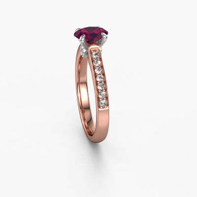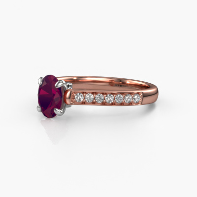 The ring shown above is called the Valorie ovl 2. We call this type of ring a pavé solitaire ring because it has one center gemstone and a band that is also pave set with gemstones. This engagement ring is made in 14 Carat rose gold set with a 7x5 mm oval rhodolite, and pave set lab grown diamonds at the sides. Each piece of jewelry is made with passion and love by one of our master goldsmiths.This fashionable rose gold pavé solitaire engagement ring has an exquisite oval rhodolite center stone. To further accentuate the center stone, the band is set full with more lab grown diamonds. Its open prong setting allows light to strike the rhodolite from various angles and this adds sparkle to your rhodolite ring. The photo shown above depicts the goldsmith's carefully handcrafted details of the ring. The high positioning of the center stone is truly eye-catching. The perfect engagement ring for the crown jewel of your life!Are you on a budget? Please feel free to contact us, so we can go discuss your options. We offer our engagement rings at guaranteed best price, because we make them to order. You won't find such a price anywhere else!Our team adds new designs to our online collection daily. Our designers and goldsmiths work together in creating the best design. We strive to offer a diverse collection of jewels. Perhaps you have a specific jewel design in mind. One you came across somewhere. Please contact us for a free consultation. We will make you an offer, based on a fair price/ quality ratio, that will baffle you.To make it easier for you, we offer a 30 day return policy. Check our terms and conditions.