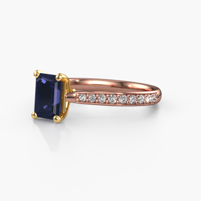 The ring shown above is called the Mignon eme 2. We call this type of ring a pavé solitaire ring because it has one center gemstone and a band that is also pave set with gemstones. The 14 Carat rose gold engagement ring is set with a emerald cut 7x5 mm sapphire center stone and the band is pave set with lab-grown diamond gemstones. Each jewel is made just for you, with attention to detail and design.This exclusive rose gold pavé solitaire engagement ring has an exquisite emerald cut sapphire center stone. To further accentuate the center stone, the band is fully set with more lab grown diamonds. Its open prong setting allows light to strike the sapphire from various angles and this adds sparkle to your sapphire ring. The photo shown above depicts the goldsmith's carefully handcrafted details of the ring. The high positioning of the center stone is truly eye-catching. The perfect engagement ring for the crown jewel of your life! Are you on a budget? Please feel free to contact us, so we can go discuss your options. We offer our engagement rings at guaranteed best price, because we make them to order. You won't find such a price anywhere else!Do you have a specific ring in mind? One you came across somewhere. Please feel free to tell us your wishes and we will turn your design into a unique engagement ring. You can follow the development of your ring design because we use 3D drawings. This gives you a realistic preview of your design. We will gladly send you a non-binding offer, based on a fair price/ quality ratio. It will amaze you.To make it easier for you, we offer a 30 day return policy. Check our terms and conditions.