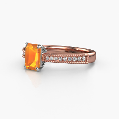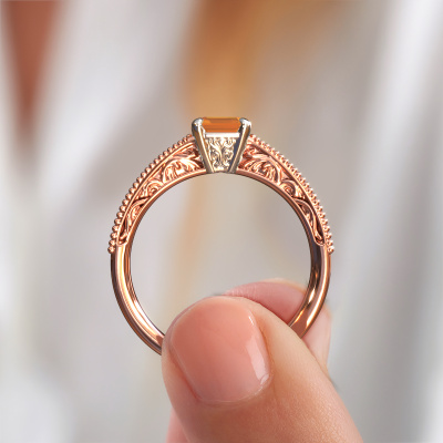 This 14 Carat rose gold ring is called Shonta EME and is set with citrin. An extraordinary rose gold vintage ring. One that will surely make the love of your life shine like a diamond! That is what we hope to achieve. This vintage engagement ring is set with exquisite citrin. Whichever gemstone you choose from our selection, is up to you. The gemstone is selected with great care because we believe your engagement ring must be adorned with nothing but the most beautiful gemstone. Wouldn't you agree? Our expert goldsmith will design your ring in our own artisan studio, where the citrin will be set with great precision. The ring will then be polished till it is absolutely perfect. Nothing but the best for the love of your life! This jewel is made by a team of passionate goldsmiths and jewel designers. This will make your crown jewel truly eye-catching.Are you on a budget? Please feel free to contact us, so we can go discuss your options. We offer our engagement rings at guaranteed best price, because we make them to order. You won't find such a price anywhere else!Have you found a specific engagement ring somewhere which you would like to give to your loved one? Please feel free to express your wishes to our jewel designers because we would be honored to turn your design into a vintage engagement ring. You can follow the development of your ring design because we use 3D drawings. This gives you a realistic preview of how your design will look. You can also preorder a dummy. A dummy is a plastic ring, which can be shaped according your ring design. You can try it on and check if its width and size are suitable for you. We will gladly send you a non-binding offer, based on a fair price/ quality ratio. It will amaze you, considering the quality of the ring and gemstones.To make it easier for you, we offer a 30 day return policy. Check our terms and conditions.