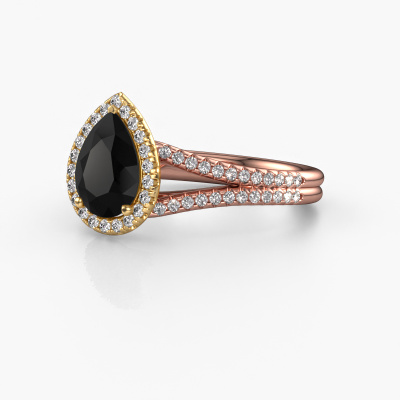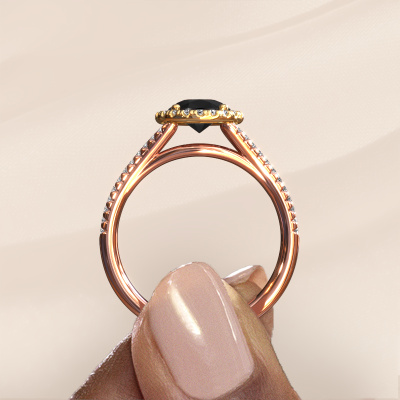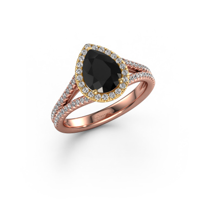 The ring shown above is called the Verla pear 2. We call this type of ring a halo ring because it has one center gemstone and a band that is also pave set with gemstones. The 14 Carat rose gold engagement ring is set with a pear 1.25 crt black diamond center stone and the band is pave set with diamonds. What makes this exclusive rose gold halo ring special are the smaller sized stones embracing the center stone. This gorgeous engagement ring is called a halo ring because the smaller gemstones give the center stone a halo of surrounding light. In order for the smaller stones to enhance the center stone, they have to be placed so there is no interference of light. And that's when our expert goldsmiths come in. Each individual stone is carefully set in the ring by hand. During manufacturing, light fall is constantly monitored to make sure the special halo is still visible. In the end you get a unique engagement ring, with a black diamond of your choosing at its centre. You can imagine the effect of a ring of such significance when you give it to her on her special day to shine. After receiving your order, our goldsmiths will passionately start the creative process of making your engagement ring in our own studio. Because we don't have a big stockpile, these costs will not be passed on to you. Our pricing is proof of that! We offer top quality jewels at lowest price, guaranteed.Our designers and goldsmiths work together each day, creating new jewels. Perhaps you have found a nice exclusive engagement ring somewhere, which can be used to customize your unique ring. Please feel free to contact us. We will make you an offer, based on a fair price/ quality ratio, which will amaze you.To make it easier for you, we offer a 30 day return policy. Check our terms and conditions.
