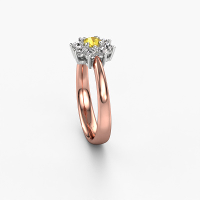 The ring shown above is called the Camille 1. We call this type of ring a cluster ring, the center gemstone is surrounded by smaller sized stones. This 14 Carat rose gold version is set with a 3.4 mm round yellow sapphire center stone, embraced by smaller diamonds. The traditional rose gold cluster engagement ring stands out because of its shape. Together, the smaller and bigger sized yellow sapphire gemstones form a flower and they appear to collide into one big sparkling gem. This traditional engagement ring is also known as the flower ring. Our expert Goldsmiths make sure the smaller diamonds stones are set identically so there is no light interference in the yellow sapphire but unity instead. With perfect precision and a skillful hand each yellow sapphire is set in the ring. During manufacturing, it is constantly monitored to make sure light reflects flawlessly. This results in a unique engagement ring, with a radiant yellow sapphire at its centre. A lovely, meaningful gift to bestow upon the love of your life. By using our modern techniques, we can design and customize the finest quality jewels with the utmost care for you. Our engagement rings are always priced 30 percent lower than other jewelers. We make engagement rings to order so we don't have to maintain a large stock. If you have a certain budget, we are more than happy to advice you accordingly.Our team adds new designs to our online collection daily. Our designers and goldsmiths work together in creating the best design. We strive to offer a diverse collection of jewels. Perhaps you have a specific jewel design in mind. One you came across somewhere. Please contact us for a free consultation. We will make you an offer, based on a fair price/ quality ratio, that will baffle you.To make it easier for you, we offer a 30 day return policy. Check our terms and conditions.