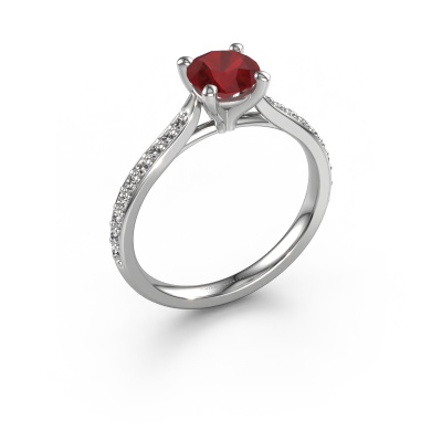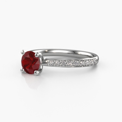 The ring shown above is called the Mignon rnd 2. We call this type of ring a pavé solitaire ring because it has one center gemstone and a band that is also pave set with gemstones. The platinum engagement ring is set with a round 6 mm ruby center stone and the band is pave set with lab-grown diamond gemstones. Each jewel is made by a team of passionate goldsmiths and jewel designers. This will make your crown jewel truly eye-catching.This luxury platinum pavé solitaire engagement ring has an exquisite round ruby center stone. To further accentuate the center stone, the band is fully set with more lab grown diamonds. Its open prong setting allows light to strike the ruby from various angles and this adds sparkle to your ruby ring. The photo shown above depicts the goldsmith's carefully handcrafted details of the ring. The high positioning of the center stone is truly eye-catching. The perfect engagement ring for the crown jewel of your life! By using our modern techniques, we can design and customize the finest quality jewels with the utmost care for you. Our engagement rings are always priced 30 percent lower than other jewelers. We make engagement rings to order so we don't have to maintain a large stock. If you have a certain budget, we are more than happy to advice you accordingly.Different styles of new rings are made daily by our team. Perhaps you have found a pavé solitaire engagement ring somewhere. One you would like to give to your loved one. Please feel free to share your thoughts and design with our jewel designers. We would love to turn your design into a luxury engagement ring. You can follow the development of your ring design because we use very detailed 3D drawings. On top of that, you can order a dummy of the design. A dummy is a plastic ring, which can be shaped according your ring design. You can try it on and check if the engagement ring is up to standard. We will gladly send you a non-binding offer, based on a fair price/ quality ratio. The offer will baffle you, considering the quality of the ring and gemstones.To make it easier for you, we offer a 30 day return policy. Check our terms and conditions.