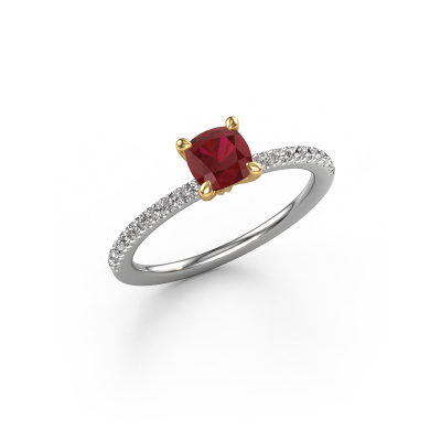 The ring shown above is called the Crystal CUS 2. We call this type of ring a pavé solitaire ring because it has one center gemstone and a band that is also pave set with gemstones. The 14 Carat white gold engagement ring is set with a cushion 5 mm ruby center stone and the band is pave set with diamond gemstones. Each jewel is made just for you by our master goldsmiths in our own studio.This classic white gold pavé solitaire engagement ring has an exquisite cushion ruby center stone. To further accentuate the center stone, the band is fully set with more diamonds. Its open prong setting allows light to strike the ruby from various angles and this adds sparkle to your ruby ring. The photo shown above depicts the goldsmith's carefully handcrafted details of the ring. The high positioning of the center stone is truly eye-catching. The perfect engagement ring for the crown jewel of your life! After receiving your order, our goldsmiths will start the creative process of making your Crystal CUS 2 engagement ring. We don't keep stock. This is advantageous because these costs will not be passed on to you. Therefore, we can offer jewelry at exceptionally low prices.Different styles of new rings are made daily by our team. Perhaps you have found a pavé solitaire engagement ring somewhere. One you would like to give to your loved one. Please feel free to share your thoughts and design with our jewel designers. We would love to turn your design into a classic engagement ring. You can follow the development of your ring design because we use very detailed 3D drawings. On top of that, you can order a dummy of the design. A dummy is a plastic ring, which can be shaped according your ring design. You can try it on and check if the engagement ring is up to standard. We will gladly send you a non-binding offer, based on a fair price/ quality ratio. The offer will baffle you, considering the quality of the ring and gemstones.To make it easier for you, we offer a 30 day return policy. Check our terms and conditions.
