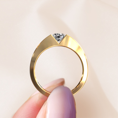 This 14 Carat gold ring is called Lizzy 1 and is set with diamond. Do you keep up with the latest fashion trends? Do you want a unique engagement ring that matches your lifestyle? This edgy engagement ring is an extraordinary ring which can be custom made to fit your or her personal style. This modern gold engagement ring is set with diamond. Our diamonds are carefully selected for this specific ring in order to create the best effect. Our expert goldsmith will create your ring in our own artisan studio where the diamond will be set with great care. The ring will then be polished to perfection. Nothing but the best for the love of your life! This jewel is created to add sparkle to your finger, each jewel is lovingly made by hand by our goldsmiths.By using our modern techniques, we can design and customize the finest quality jewels with the utmost care for you. Our engagement rings are always priced 30 percent lower than other jewelers. We make engagement rings to order so we don't have to maintain a large stock. If you have a certain budget, we are more than happy to advice you accordingly.Do you have a specific ring in mind? One you came across somewhere. Please feel free to tell us your wishes and we will turn your design into a unique engagement ring. You can follow the development of your ring design because we use 3D drawings. This gives you a realistic preview of your design. We will gladly send you a non-binding offer, based on a fair price/ quality ratio. It will amaze you.To make it easier for you, we offer a 30 day return policy. Check our terms and conditions.