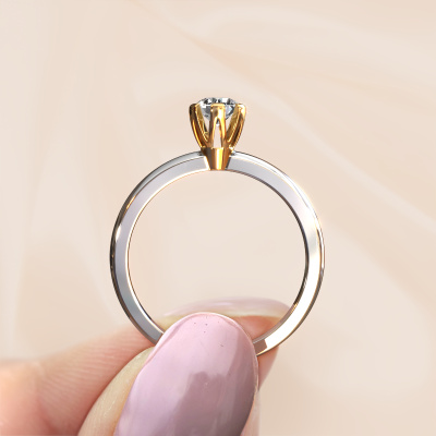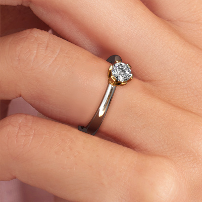 The ring shown above is called the Julia, we call this a solitaire ring because it contains a single gemstone. The engagement ring is made in 14 Carat white gold and has a round diamond of 0.30 crt. This trendy white gold solitaire ring with exquisite round diamond is a beautiful engagement ring. The open prong setting allows light to strike the gemstone from various angles. The ring also stands out because of the high positioning of the gemstone. Because diamonds symbolize true love and purity, they make the perfect gift for the love of your life. The symbol of eternal love is the centerpiece of this solitaire ring. Like a diamond, all other types of precious metal have their own attributed symbolic meaning. You can compile the solitaire engagement ring yourself in various precious metal combinations. This one has the combination of 14 Carat white gold with gold. Each piece of jewelry is created to add sparkle to your finger, each jewel is lovingly made by hand by our goldsmiths.Are you on a budget? Please feel free to contact us, so we can go discuss your options. We offer our engagement rings at guaranteed best price, because we make them to order. You won't find such a price anywhere else!Different styles of new rings are made daily by our team. Perhaps you have found a solitaire engagement ring somewhere. One you would like to give to your loved one. Please feel free to share your thoughts and design with our jewel designers. We would love to turn your design into a trendy engagement ring. You can follow the development of your ring design because we use very detailed 3D drawings. On top of that, you can order a dummy of the design. A dummy is a plastic ring, which can be shaped according your ring design. You can try it on and check if the engagement ring is up to standard. We will gladly send you a non-binding offer, based on a fair price/ quality ratio. The offer will baffle you, considering the quality of the ring and gemstones.To make it easier for you, we offer a 30 day return policy. Check our terms and conditions.