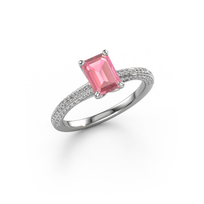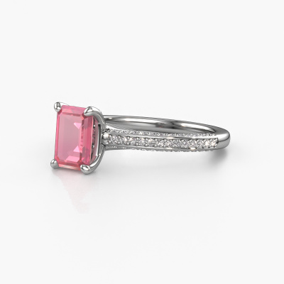 The ring shown above is called the Elenore eme. We call this type of ring a pavé solitaire ring because it has one center gemstone and a band that is also pave set with gemstones. This engagement ring is made in platinum set with a 7x5 mm emerald cut tourmaline pink, and pave set lab grown diamonds at the sides. Each piece of jewelry is made just for you, with attention to detail and design.This exclusive platinum pavé solitaire engagement ring has an exquisite emerald cut tourmaline pink center stone. To further accentuate the center stone, the band is set full with more lab grown diamonds. Its open prong setting allows light to strike the tourmaline pink from various angles and this adds sparkle to your tourmaline pink ring. The photo shown above depicts the goldsmith's carefully handcrafted details of the ring. The high positioning of the center stone is truly eye-catching. The perfect engagement ring for the crown jewel of your life!Are you on a budget? Please feel free to contact us, so we can go discuss your options. We offer our engagement rings at guaranteed best price, because we make them to order. You won't find such a price anywhere else!Have you found a specific engagement ring somewhere which you would like to give to your loved one? Please feel free to express your wishes to our jewel designers because we would be honored to turn your design into a exclusive engagement ring. You can follow the development of your ring design because we use 3D drawings. This gives you a realistic preview of how your design will look. You can also preorder a dummy. A dummy is a plastic ring, which can be shaped according your ring design. You can try it on and check if its width and size are suitable for you. We will gladly send you a non-binding offer, based on a fair price/ quality ratio. It will amaze you, considering the quality of the ring and gemstones.To make it easier for you, we offer a 30 day return policy. Check our terms and conditions.