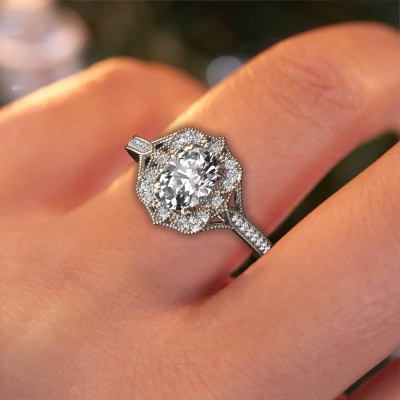 This 14 Carat white gold ring is called Loni and is set with 0.983 crt lab-grown diamond. This filigree white gold engagement ring is a true work of art! A beautifully adorned design of intricate wires. With dedication, patience and the utmost precision, our expert goldsmith will design a ring just for you. The adornment of small wiring is crafted to perfection by hand. It's a lengthy process which includes welding, crafting and polishing until our Goldsmiths are completely satisfied with the result: a perfect eye-catching ring that makes her shine with delight. Therefore the vintage filigree engagement ring is an extraordinary gift to bestow upon the love of your life. A handmade one-of-a-kind personalized ring, to be given to that special someone on that special moment when you pop the question. Isn't that wonderful? This piece of jewelry is made with passion and love by one of our master goldsmiths.Because we design and deliver our own rings, we can offer you a engagement ring at a price you won't find anywhere else. A ring is made to order, which helps prevent excess supplies, so we can make you a great price offer. We understand it feels risky, buying your engagement ring online, but we will gladly assist in the designing process, taking your budget into consideration.Our team adds new designs to our online collection daily. Our designers and goldsmiths work together in creating the best design. We strive to offer a diverse collection of jewels. Perhaps you have a specific jewel design in mind. One you came across somewhere. Please contact us for a free consultation. We will make you an offer, based on a fair price/ quality ratio, that will baffle you.To make it easier for you, we offer a 30 day return policy. Check our terms and conditions.