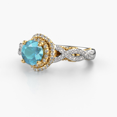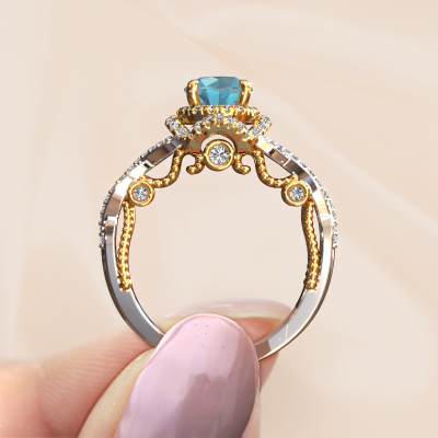 The ring shown above is called the Leora. We call this type of ring a halo ring because it has one center gemstone and a band that is also pave set with gemstones. The 14 Carat white gold engagement ring is set with a round 6.5 mm blue topaz center stone and the band is pave set with lab grown diamonds. What makes this vintage white gold halo ring special are the smaller sized stones embracing the center stone. This gorgeous engagement ring is called a halo ring because the smaller gemstones give the center stone a halo of surrounding light. In order for the smaller stones to enhance the center stone, they have to be placed so there is no interference of light. And that's when our expert goldsmiths come in. Each individual stone is carefully set in the ring by hand. During manufacturing, light fall is constantly monitored to make sure the special halo is still visible. In the end you get a unique engagement ring, with a blue topaz of your choosing at its centre. You can imagine the effect of a ring of such significance when you give it to her on her special day to shine. By using our modern techniques, we can design and customize the finest quality jewels with the utmost care for you. Our engagement rings are always priced 30 percent lower than other jewelers. We make engagement rings to order so we don't have to maintain a large stock. If you have a certain budget, we are more than happy to advice you accordingly.Our designers and goldsmiths work together each day, creating new jewels. Perhaps you have found a nice vintage engagement ring somewhere, which can be used to customize your unique ring. Please feel free to contact us. We will make you an offer, based on a fair price/ quality ratio, which will amaze you.To make it easier for you, we offer a 30 day return policy. Check our terms and conditions.