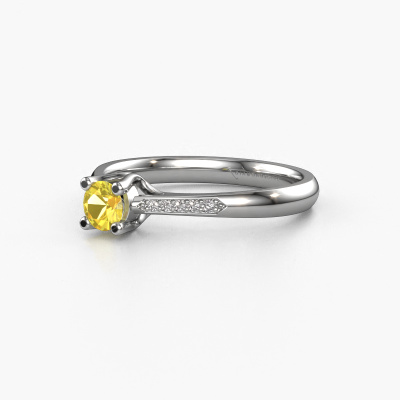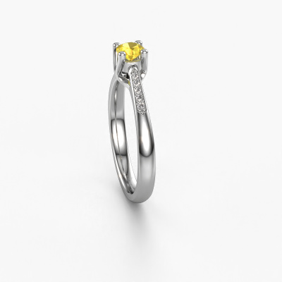 The ring shown above is called the Janna 2. We call this type of ring a pavé solitaire ring because it has one center gemstone and a band that is also pave set with gemstones. This promise ring is made in platinum set with a 4 mm round yellow sapphire, and pave set diamonds at the sides. Each piece of jewelry is made just for you by our master goldsmiths in our own studio.This classic platinum pavé solitaire promise ring has an exquisite round yellow sapphire center stone. To further accentuate the center stone, the band is set full with more diamonds. Its open prong setting allows light to strike the yellow sapphire from various angles and this adds sparkle to your yellow sapphire ring. The photo shown above depicts the goldsmith's carefully handcrafted details of the ring. The high positioning of the center stone is truly eye-catching. The perfect promise ring for the crown jewel of your life!By using a combination of the latest modern techniques, combined with ancient crafting, we can make all our promise ring in our own studio. Each jewel is made to order. This is advantageous because we can offer you a price you won't find anywhere else.Do you have a specific ring in mind? One you came across somewhere. Please feel free to tell us your wishes and we will turn your design into a unique promise ring. You can follow the development of your ring design because we use 3D drawings. This gives you a realistic preview of your design. We will gladly send you a non-binding offer, based on a fair price/ quality ratio. It will amaze you.To make it easier for you, we offer a 30 day return policy. Check our terms and conditions.