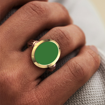 The solid Jake 3 signet ring with oval shape green enamel stone top, as shown above, is filled with tradition. Customary, the signet ring was passed down from father to son. Start your own tradition with this solid rose gold signet ring. We are also more than happy to engrave your ring with a monogram or family crest. Please check our database for further inquiries and options. You can find the departments of our education center at the bottom of this page. Start a new tradition with the classic rose gold Jake 3 signet ring. The royal Jake 3 signet ring, as shown here, can be customized to your liking. Our online tool offers many different options but please feel free to contact us if you want changes made to your Jake 3 signet ring, which are unavailable in our online tool.Our talented designers add new designs to our online collection daily. Together they create a diverse collection of the finest jewelry. If you prefer to make a ring according your own design, please feel free to request a quote. We will make you an amazing offer, based on quality and price.By using a combination of the latest modern techniques, combined with ancient crafting, we can make all our rings in our own studio. Each jewel is made to order. This is advantageous because we can offer you a price you won't find anywhere else.To make it easier for you, we offer a 30 day return policy. Check our terms and conditions.