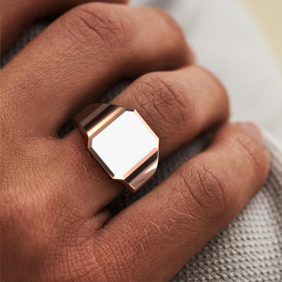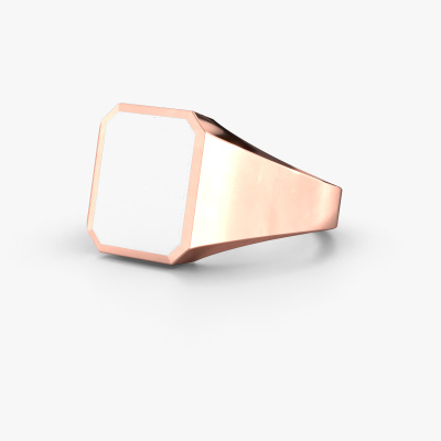 The rectangular Lars 2 signet ring with octagon white enamel stone top, as shown above, is filled with tradition. Customary, the signet ring was passed down from father to son. Start your own tradition with this rectangular rose gold signet ring. We are also more than happy to engrave your ring with a monogram or family crest. Please check our database for further inquiries and options. You can find the departments of our education center at the bottom of this page. Start a new tradition with the traditional rose gold Lars 2 signet ring. The affordable Lars 2 signet ring, as shown here, can be customized to your liking. Our online tool offers many different options but please feel free to contact us if you want changes made to your Lars 2 signet ring, which are unavailable in our online tool.Our team of talented, passionate designers add new ring designs to our online collection daily. Our objective in doing so, is to be able to offer you a wide variety of jewels. Please feel free to request a quote if you have specific wishes for your ring. We guarantee to make you an offer you can't refuse.By using our modern techniques, we can design and customize the finest quality jewels with the utmost care for you. Our rings are always priced 30 percent lower than other jewelers. We make rings to order, so we don't have to maintain a large stock. If you have a certain budget, we are more than happy to advice you accordingly.To make it easier for you, we offer a 30 day return policy. Check our terms and conditions.