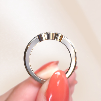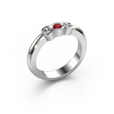 This extraordinary ring is called Lotte 3. This type of ring is known as a memoire ring, because its gemstones are set in a continuous line. This makes it easy to combine with other rings. The band of this 14 Carat white gold ring is set in a combination of ruby and diamond 3 mm. You can easily choose the combination you prefer online. As you can see, a single ruby is set in this single alliance white gold ring. The memoire ring represents collaboration. And that is precisely what these gemstones do, collaborate. Together they add a beautiful effect to the band of a modern ring! Such a meaningful ring, wouldn't you agree? All of our hand selected ruby are positioned by hand by our expert goldsmith. It's a precise task, which can only be completed successfully through the combination of pure craftsmanship and usage of the latest techniques which give it an optimal effect. To create a perfect reflection of light, all the gemstones have to be perfectly aligned in the same way. During manufacturing, the expert goldsmith will therefore monitor the reflection of light constantly to check whether the ruby are aligned properly. This requires a skilled hand and a lot of patience but then the end product will be a true piece of art. And that is our mission!By using a combination of the latest modern techniques, combined with ancient crafting, we can make all our rings in our own studio. Each jewel is made to order. This is advantageous because we can offer you a price you won't find anywhere else.Our team of talented, passionate designers add new ring designs to our online collection daily. Our objective in doing so, is to be able to offer you a wide variety of jewels. Please feel free to request a quote if you have specific wishes for your ring. We guarantee to make you an offer you can't refuse.To make it easier for you, we offer a 30 day return policy. Check our terms and conditions.