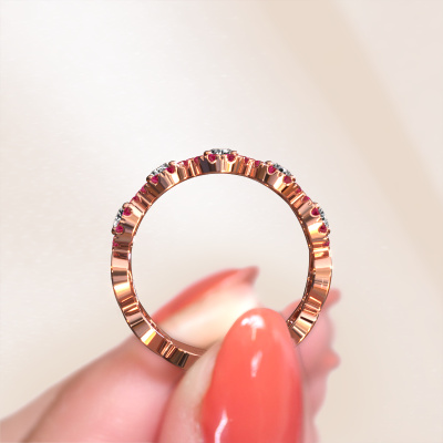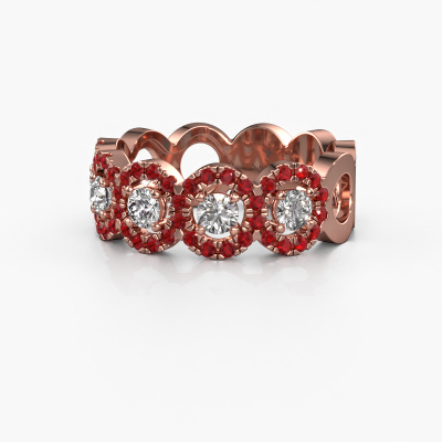 This Tanisha ring in 14 Carat rose gold is set with ruby. This rose gold stacked Tanisha ring is the perfect addition to your ring collection! As the name suggests, it is a ring which can be combined on one finger with another ring. It gives you the opportunity to create your own style. A stacked ring usually represents a certain memory of someone special or a memorable moment. It is common to combine a stacked ring, representing an anniversary, with a wedding ring. But this graceful ring, combined with your other rings, also makes a classy fashion item. The best part of this graceful ring is that you can customize it to your own liking. Your style, your choice, your ring. On top of that, your classic rose gold ring will be made by hand with eco-friendly materials! Please feel free to easily customize the ring, using our online tool.By using a combination of the latest modern techniques, combined with ancient crafting, we can make all our rings in our own studio. Each jewel is made to order. This is advantageous because we can offer you a price you won't find anywhere else.To make it easier for you, we offer a 30 day return policy. Check our terms and conditions.