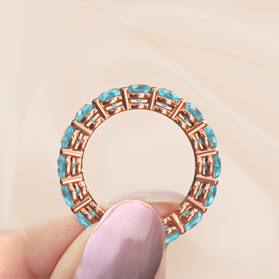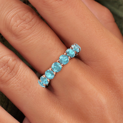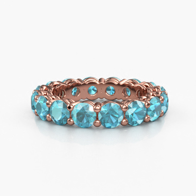 This is our Michelle full 4.2 ring. This specific type is called an eternity ring and it is set with a continuous line of identically cut gemstones. The ring is made in 14 Carat rose gold and is set with small blue topaz, 4.2 mm. This rose gold Eternity ring is a perfectly beautiful and meaningful way to give your proposal that special touch. The magnificent evenly shaped blue topaz are pave set around the ring. The identical blue topaz are carefully selected to give the ring a maximum effect. Do keep in mind we use natural resources so small differences between stones are common. The special effect is enhanced due to precise positioning of the blue topaz. This requires the utmost precision and a skillful hand but for our skilled artisans this is what excites them. The result is a stackable ring with a row of blue topaz which seem to have no beginning nor end. The perfect symbol of your love for her! Isn't she a beauty?After receiving your order, our goldsmiths will start the creative process of making your Michelle full 4.2 ring. We don't keep stock. This is advantageous because these costs will not be passed on to you. Therefore, we can offer jewelry at exceptionally low prices.New jewelry designs are added to our online collection daily. Our team of passionate designers strive to create extraordinary and diverse designs. Have you seen a ring you like? Please feel free to contact us. Based on a good price/ quality ratio, we will make you an offer you can't refuse!To make it easier for you, we offer a 30 day return policy. Check our terms and conditions.