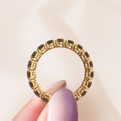 This is our Vivienne 3.4 ring. This specific type is called an eternity ring and it is set with a continuous line of identically cut gemstones. The ring is made in 14 Carat gold and is set with small smokey quartz, 3.4 mm. The amazing smokey quartz are identical in size and are set in the ring band. Our smokey quartz are selected with great care so they are identical, which gives the best result. In order to get the best result, our artisans position all smokey quartz by hand with the utmost care. Our Goldsmiths have one ambition, which is creating the perfect ring. That is why we love what we do. In the end you get a stunning classic gold stackable ring with a row of smokey quartz which seem to have no beginning nor end. The perfect symbol of your undying love for her! How special is that!Are you on a budget? Please feel free to contact us, so we can go discuss your options. We offer our rings at guaranteed best price, because we make them to order. You won't find such a price anywhere else!Our team of talented, passionate designers add new ring designs to our online collection daily. Our objective in doing so, is to be able to offer you a wide variety of jewels. Please feel free to request a quote if you have specific wishes for your ring. We guarantee to make you an offer you can't refuse.To make it easier for you, we offer a 30 day return policy. Check our terms and conditions.