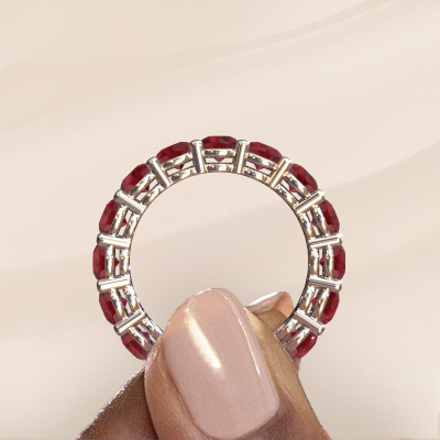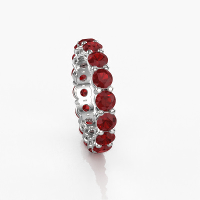 This is our Michelle full 4.0 ring. This specific type is called an eternity ring and it is set with a continuous line of identically cut gemstones. The ring is made in 14 Carat white gold and is set with small ruby, 4 mm. The amazing ruby are identical in size and are set in the ring band. Our ruby are selected with great care so they are identical, which gives the best result. In order to get the best result, our artisans position all ruby by hand with the utmost care. Our Goldsmiths have one ambition, which is creating the perfect ring. That is why we love what we do. In the end you get a stunning modern white gold stackable ring with a row of ruby which seem to have no beginning nor end. The perfect symbol of your undying love for her! How special is that!By using a combination of the latest modern techniques, combined with ancient crafting, we can make all our rings in our own studio. Each jewel is made to order. This is advantageous because we can offer you a price you won't find anywhere else.Our talented designers add new designs to our online collection daily. Together they create a diverse collection of the finest jewelry. If you prefer to make a ring according your own design, please feel free to request a quote. We will make you an amazing offer, based on quality and price.To make it easier for you, we offer a 30 day return policy. Check our terms and conditions.