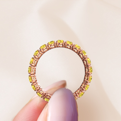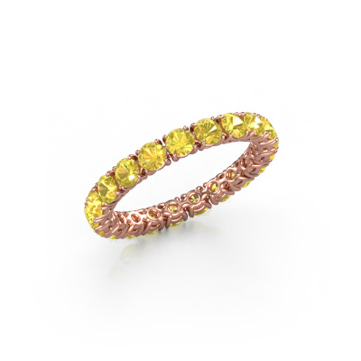 This is our Vivienne 2.9 ring. This specific type is called an eternity ring and it is set with a continuous line of identically cut gemstones. The ring is made in 14 Carat rose gold and is set with small yellow sapphire, 2.9 mm. This rose gold Eternity ring is a perfectly beautiful and meaningful way to give your proposal that special touch. The magnificent evenly shaped yellow sapphire are pave set around the ring. The identical yellow sapphire are carefully selected to give the ring a maximum effect. Do keep in mind we use natural resources so small differences between stones are common. The special effect is enhanced due to precise positioning of the yellow sapphire. This requires the utmost precision and a skillful hand but for our skilled artisans this is what excites them. The result is a ring with a row of yellow sapphire which seem to have no beginning nor end. The perfect symbol of your love for her! Isn't she a beauty?By using our modern techniques, we can design and customize the finest quality jewels with the utmost care for you. Our rings are always priced 30 percent lower than other jewelers. We make rings to order, so we don't have to maintain a large stock. If you have a certain budget, we are more than happy to advice you accordingly.New jewelry designs are added to our online collection daily. Our team of passionate designers strive to create extraordinary and diverse designs. Have you seen a ring you like? Please feel free to contact us. Based on a good price/ quality ratio, we will make you an offer you can't refuse!To make it easier for you, we offer a 30 day return policy. Check our terms and conditions.