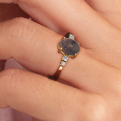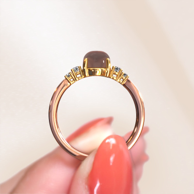 In this photo the rose gold Jelke ring is set with a cabochon smokey quartz. Cabochon means a smokey quartz is shaped first, not faceted, into a specific shape, such as a drop, heart or oval cabochon. Subsequently, it is polished until the gemstone has a orb shaped surface. A cabochon gemstone is a stunning, classy eye-catcher that matches perfectly with a contemporary as well as a vintage style. Our expert goldsmiths shape the daring ring to perfection which makes it unique. The cabochon smokey quartz is set so its unique qualities are strengthened. Customize your own daringJelke ring, which will then be created by our goldsmiths with great passion. Do you prefer a different option than is shown here in the rose gold Jelke ring? Then our online tools offers various options. Feel free to ask us for help if you are unable to succeed. We are happy to answer your questions!By using our modern techniques, we can design and customize the finest quality jewels with the utmost care for you. Our rings are always priced 30 percent lower than other jewelers. We make rings to order, so we don't have to maintain a large stock. If you have a certain budget, we are more than happy to advice you accordingly.To make it easier for you, we offer a 30 day return policy. Check our terms and conditions.