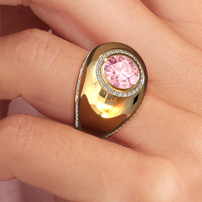 This is a stunning birthstones gold Roxann ring. It is set with pink lab grown diamond. A designer ring, fit for classy women. The ring is designed by our own expert goldsmiths. In our artisan studio, we use a combination of the latest techniques