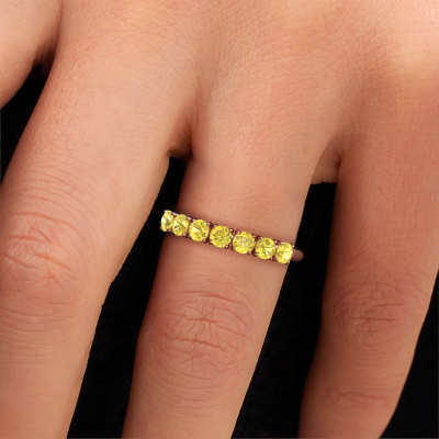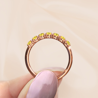 How would you describe your own style? Are you looking for something uniquely different? This half eternity rose gold Vivienne Half ring is astonishing! Simply customize to your or her own liking. This ring is set with yellow sapphire. These yellow sapphire have been carefully selected because your ring must be adorned with nothing but the most beautiful gemstone. Wouldn't you agree? Our expert goldsmith will create your ring in our own crafting studios, where the yellow sapphire will be set with care. The ring will then be polished to perfection to give it that extra sparkle. It's a perfect ring for a woman of excellent taste!As soon as you finished designing your Vivienne Half ring with our online tool, our goldsmiths will start their creative process of making your ring. This will be done with passion and care, according ancient crafting. On top of that, our jewels are made of eco-friendly materials. Simply customize online with our online tool, if you want any changes made. If you want specific changes made to your Vivienne Half ring, that are unavailable in our online tool, please feel free to contact our expert designers.By using our modern techniques, we can design and customize the finest quality jewels with the utmost care for you. Our rings are always priced 30 percent lower than other jewelers. We make rings to order, so we don't have to maintain a large stock. If you have a certain budget, we are more than happy to advice you accordingly.To make it easier for you, we offer a 30 day return policy. Check our terms and conditions.