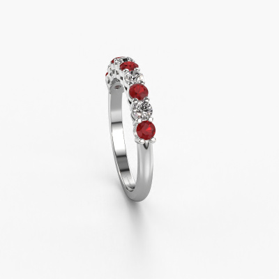 This extraordinary ring is called Michelle 9. This type of ring is known as a memoire ring, because its gemstones are set in a continuous line. This makes it easy to combine with other rings. The band of this platinum ring is set in a combination of ruby and lab-grown diamond 2.7 mm. You can easily choose the combination you prefer online. As you can see, a single ruby is set in this single alliance platinum ring. The memoire ring represents collaboration. And that is precisely what these gemstones do, collaborate. Together they add a beautiful effect to the band of a classic ring! Such a meaningful ring, wouldn't you agree? All of our hand selected ruby are positioned by hand by our expert goldsmith. It's a precise task, which can only be completed successfully through the combination of pure craftsmanship and usage of the latest techniques which give it an optimal effect. To create a perfect reflection of light, all the gemstones have to be perfectly aligned in the same way. During manufacturing, the expert goldsmith will therefore monitor the reflection of light constantly to check whether the ruby are aligned properly. This requires a skilled hand and a lot of patience but then the end product will be a true piece of art. And that is our mission!Because we design and deliver our own rings, we can offer you a ring at a price you won't find anywhere else. A ring is made to order, which helps prevent excess supplies, so we can make you a great price offer. We understand it feels risky, buying your ring online, but we will gladly assist in the designing process, taking your budget into consideration.Our team of talented, passionate designers add new ring designs to our online collection daily. Our objective in doing so, is to be able to offer you a wide variety of jewels. Please feel free to request a quote if you have specific wishes for your ring. We guarantee to make you an offer you can't refuse.To make it easier for you, we offer a 30 day return policy. Check our terms and conditions.