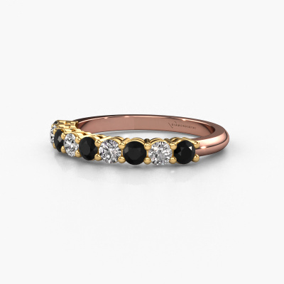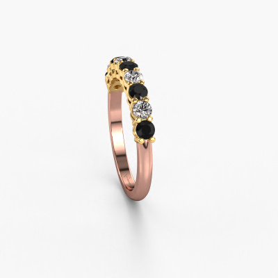 This extraordinary ring is called Michelle 9. This type of ring is known as a memoire ring, because its gemstones are set in a continuous line. This makes it easy to combine with other rings. The band of this 14 Carat rose gold ring is set in a combination of black diamond and lab-grown diamond 0.80 crt. You can easily choose the combination you prefer online. As you can see, a single black diamond is set in this single alliance rose gold ring. The memoire ring represents collaboration. And that is precisely what these gemstones do, collaborate. Together they add a beautiful effect to the band of a classic ring! Such a meaningful ring, wouldn't you agree? All of our hand selected black diamonds are positioned by hand by our expert goldsmith. It's a precise task, which can only be completed successfully through the combination of pure craftsmanship and usage of the latest techniques which give it an optimal effect. To create a perfect reflection of light, all the gemstones have to be perfectly aligned in the same way. During manufacturing, the expert goldsmith will therefore monitor the reflection of light constantly to check whether the black diamonds are aligned properly. This requires a skilled hand and a lot of patience but then the end product will be a true piece of art. And that is our mission!Because we design and deliver our own rings, we can offer you a ring at a price you won't find anywhere else. A ring is made to order, which helps prevent excess supplies, so we can make you a great price offer. We understand it feels risky, buying your ring online, but we will gladly assist in the designing process, taking your budget into consideration.Our team of talented, passionate designers add new ring designs to our online collection daily. Our objective in doing so, is to be able to offer you a wide variety of jewels. Please feel free to request a quote if you have specific wishes for your ring. We guarantee to make you an offer you can't refuse.To make it easier for you, we offer a 30 day return policy. Check our terms and conditions.