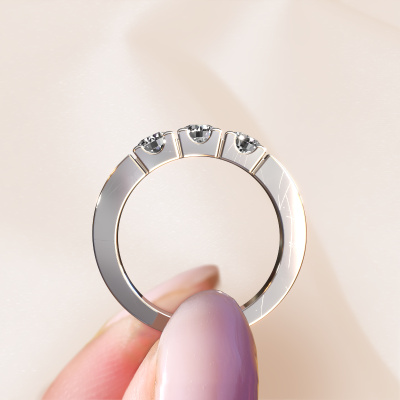 This extraordinary ring is called Dana 3. This type of ring is known as a memoire ring, because its gemstones are set in a continuous line. This makes it easy to combine with other rings. The band of this 14 Carat white gold ring is set in a combination of lab-grown diamond and lab-grown diamond 0.75 crt. You can easily choose the combination you prefer online. As you can see, a single lab-grown diamond is set in this single alliance white gold ring. The memoire ring represents collaboration. And that is precisely what these gemstones do, collaborate. Together they add a beautiful effect to the band of a modern ring! Such a meaningful ring, wouldn't you agree? All of our hand selected lab grown diamonds are positioned by hand by our expert goldsmith. It's a precise task, which can only be completed successfully through the combination of pure craftsmanship and usage of the latest techniques which give it an optimal effect. To create a perfect reflection of light, all the gemstones have to be perfectly aligned in the same way. During manufacturing, the expert goldsmith will therefore monitor the reflection of light constantly to check whether the lab grown diamonds are aligned properly. This requires a skilled hand and a lot of patience but then the end product will be a true piece of art. And that is our mission!After receiving your order, our goldsmiths will passionately start the creative process of making your ring in our own studio. Because we don't have a big stockpile, these costs will not be passed on to you. Our pricing is proof of that! We offer top quality jewels at lowest price, guaranteed.Our talented designers add new designs to our online collection daily. Together they create a diverse collection of the finest jewelry. If you prefer to make a ring according your own design, please feel free to request a quote. We will make you an amazing offer, based on quality and price.To make it easier for you, we offer a 30 day return policy. Check our terms and conditions.