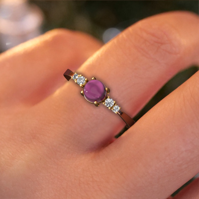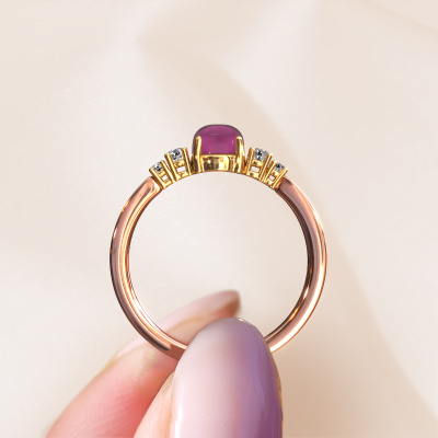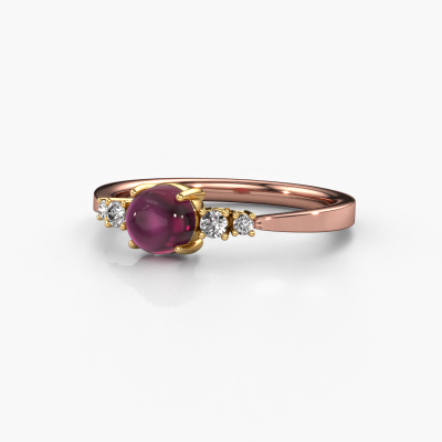 In this photo the rose gold Regine ring is set with a cabochon rhodolite. Cabochon means a rhodolite is shaped first, not faceted, into a specific shape, such as a drop, heart or round cabochon. Subsequently, it is polished until the gemstone has a orb shaped surface. A cabochon gemstone is a stunning, classy eye-catcher that matches perfectly with a contemporary as well as a vintage style. Our expert goldsmiths shape the 5 stones ring to perfection which makes it unique. The cabochon rhodolite is set so its unique qualities are strengthened. Our goldsmiths passionately create your customized ring to your liking with the utmost care. The rose gold ring, as shown here, can be customized using our online tool. Feel free to ask our jewel designers for assistance if you want changes made which are unavailable in our online tool. We are happy to answer your questions.Are you on a budget? Please feel free to contact us, so we can go discuss your options. We offer our rings at guaranteed best price, because we make them to order. You won't find such a price anywhere else!To make it easier for you, we offer a 30 day return policy. Check our terms and conditions.