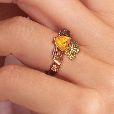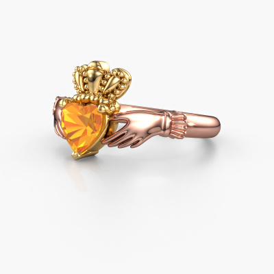 This Irish Claddagh ring is a sign of love set with a heart citrin. It is a remarkable, symbolic ring in which a crowned heart, held by two hands, is shown. The heart of a Claddagh ring is a symbol of love, the hands represent friendship and the crown, loyalty. A beautiful piece of jewelry to either give or receive! This symbolic 14 Carat rose gold Claddagh 2 ring is made by hand in our own studio by our expert goldsmiths. The symbolic Claddagh 2 ring, as shown here, can be customized to your liking. Our online tool offers many different options but please feel free to contact us if you want changes made to your Claddagh 2 ring, which are unavailable in our online tool.After receiving your order, our goldsmiths will start the creative process of making your Claddagh 2 ring. We don't keep stock. This is advantageous because these costs will not be passed on to you. Therefore, we can offer jewelry at exceptionally low prices.To make it easier for you, we offer a 30 day return policy. Check our terms and conditions.