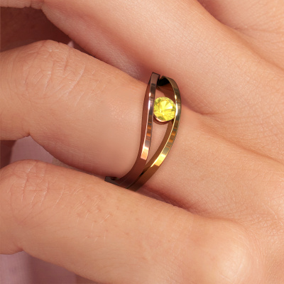 This ring called Sigrid 1 is made of 14 Carat rose gold and is set with yellow sapphire. Are you in the market for a unique rose gold ring with a modern twist? Then this ring might suit you. Simply customize to your or her liking. It suits the contemporary modern woman. This twist ring is set with beautiful yellow sapphire. This has been carefully selected. Because your ring must be adorned with nothing but the most stunning gemstone. Our expert goldsmith will create your ring in our own studio, where the yellow sapphire will be set with great care. The ring will then be polished to perfection to create a stunning ring. By using our modern techniques, we can design and customize the finest quality jewels with the utmost care for you. Our rings are always priced 30 percent lower than other jewelers. We make rings to order, so we don't have to maintain a large stock. If you have a certain budget, we are more than happy to advice you accordingly.Our team of talented, passionate designers add new ring designs to our online collection daily. Our objective in doing so, is to be able to offer you a wide variety of jewels. Please feel free to request a quote if you have specific wishes for your ring. We guarantee to make you an offer you can't refuse.To make it easier for you, we offer a 30 day return policy. Check our terms and conditions.