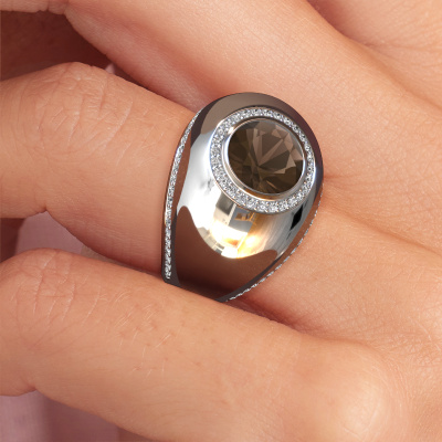 This is a stunning birthstones white gold Roxann ring. It is set with smokey quartz. A designer ring, fit for classy women. The ring is designed by our own expert goldsmiths. In our artisan studio, we use a combination of the latest techniques and