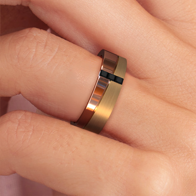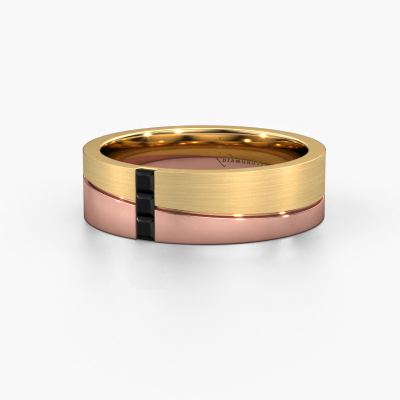 A unique two-tone rose gold ladies wedding ring, designed by you, and then artfully crafted by our goldsmith in our own artisan studio! A beautiful symbol, reflecting your love, which you carry with you for a lifetime! Each ring we offer is artfully forged by hand in our own crafting studio. This makes it possible for us to create you a ring which is customized to your liking, completely mat/shiny your style. This modern WH0906L16A wedding ring is set with black diamond, is ±0.24 in (6 mm) wide and has a mat/shiny finish. You can choose the combination of precious metals of your preference in our online tool. Anything goes! It is wise to browse through the characteristics of each different precious metal. For example, gold and silver are softer metals. Carat is determined by the amount of added extra metals. If the goldsmith doesn't add a lot, carat is higher and the wedding ring will be softer. If he adds more metals, the jewel has a lower amount of carat. A softer precious metal can still be used for your modern wedding ring! If you prefer a precious metal which will last a lifetime, we recommend platinum. This is the most solid and durable metal our goldsmith uses.Do you have special preferences regarding your wedding ring? For instance, a smaller or a wider band? Or perhaps a shiny or a matte ring? There are numerous variations possible. You can always discuss the possibilities with our jewelry designers. If you have certain wedding rings in mind, our designers will gladly help by drawing the rings of your dreams. Be sure to contact us!After receiving your order, our goldsmiths will start the creative process of making your wedding rings. We don't keep stock. This is advantageous because these costs will not be passed on to you. Therefore, our quality wedding rings are always priced 30 percent lower than those of other jewelers.To make it easier for you, we offer a 30 day return policy. Check our terms and conditions.