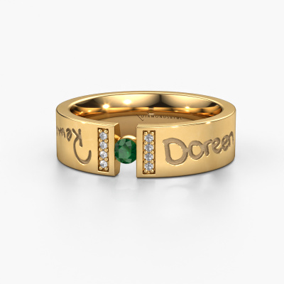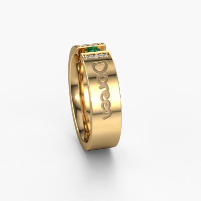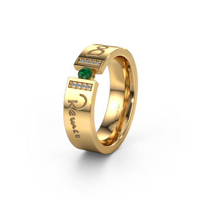 A unique wedding ring with emerald! What makes this ladies wedding ring WH2094L16C special, is that you can have it engraved with a special text, which has meaning to you. A word, a short phrase or part of the lyrics to a song. Whichever text is most meaningful to you. Memorialize it as an exquisite engravement on this modern wedding ring. This own Text ladies wedding ring has an ±0.24 in (6 mm) width. You can choose the combination of precious metals of your preference in our online tool. Anything goes! It is wise to browse through the characteristics of each different precious metal. For example, gold and silver are softer metals. Carat is determined by the amount of added extra metals. If the goldsmith doesn't add a lot, carat is higher and the wedding ring will be softer. If he adds more metals, the jewel has a lower amount of carat. A softer precious metal can still be used for your modern wedding ring! If you prefer a precious metal which will last a lifetime, we recommend platinum. This is the most solid and durable metal our goldsmith uses.This wedding ring can also serve as a source of inspiration. Would you like the ring to have a matte or shiny finish (at no additional cost), or would you prefer it to be wider or narrower? Anything is possible. Because there are countless variations, we can’t show everything on our website. Do you have an idea for beautiful wedding rings, or have you seen a stunning set of wedding rings elsewhere? Feel free to contact us; our designers are ready to assist you.By combining our modern techniques with ancient crafting, we can design and customize the finest quality jewels with the utmost care for you at the best price. Our wedding rings are always priced 30% lower than those of other jewelers. We make wedding rings to order so we don't have to maintain a large stock.To make it easier for you, we offer a 30 day return policy. Check our terms and conditions.