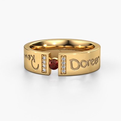 A unique wedding ring with garnet! What makes this ladies wedding ring WH2094L16C special, is that you can have it engraved with a special text, which has meaning to you. A word, a short phrase or part of the lyrics to a song. Whichever text is most meaningful to you. Memorialize it as an exquisite engravement on this modern wedding ring. This own Text ladies wedding ring has an ±0.24 in (6 mm) width. You can choose the combination of precious metals of your preference in our online tool. Anything goes! It is wise to browse through the characteristics of each different precious metal. For example, gold and silver are softer metals. Carat is determined by the amount of added extra metals. If the goldsmith doesn't add a lot, carat is higher and the wedding ring will be softer. If he adds more metals, the jewel has a lower amount of carat. A softer precious metal can still be used for your modern wedding ring! If you prefer a precious metal which will last a lifetime, we recommend platinum. This is the most solid and durable metal our goldsmith uses.This wedding ring can also serve as a source of inspiration. Would you like the ring to have a matte or shiny finish (at no additional cost), or would you prefer it to be wider or narrower? Anything is possible. Because there are countless variations, we can’t show everything on our website. Do you have an idea for beautiful wedding rings, or have you seen a stunning set of wedding rings elsewhere? Feel free to contact us; our designers are ready to assist you.By combining our modern techniques with ancient crafting, we can design and customize the finest quality jewels with the utmost care for you at the best price. Our wedding rings are always priced 30% lower than those of other jewelers. We make wedding rings to order so we don't have to maintain a large stock.To make it easier for you, we offer a 30 day return policy. Check our terms and conditions.