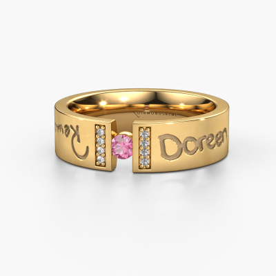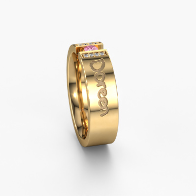 A unique wedding ring with pink sapphire! What makes this ladies wedding ring WH2094L16C special, is that you can have it engraved with a special text, which has meaning to you. A word, a short phrase or part of the lyrics to a song. Whichever text is most meaningful to you. Memorialize it as an exquisite engravement on this modern wedding ring. This own Text ladies wedding ring has an ±0.24 in (6 mm) width. You can choose the combination of precious metals of your preference in our online tool. Anything goes! It is wise to browse through the characteristics of each different precious metal. For example, gold and silver are softer metals. Carat is determined by the amount of added extra metals. If the goldsmith doesn't add a lot, carat is higher and the wedding ring will be softer. If he adds more metals, the jewel has a lower amount of carat. A softer precious metal can still be used for your modern wedding ring! If you prefer a precious metal which will last a lifetime, we recommend platinum. This is the most solid and durable metal our goldsmith uses.This wedding ring can also serve as a source of inspiration. Would you like the ring to have a matte or shiny finish (at no additional cost), or would you prefer it to be wider or narrower? Anything is possible. Because there are countless variations, we can’t show everything on our website. Do you have an idea for beautiful wedding rings, or have you seen a stunning set of wedding rings elsewhere? Feel free to contact us; our designers are ready to assist you.By combining our modern techniques with ancient crafting, we can design and customize the finest quality jewels with the utmost care for you at the best price. Our wedding rings are always priced 30% lower than those of other jewelers. We make wedding rings to order so we don't have to maintain a large stock.To make it easier for you, we offer a 30 day return policy. Check our terms and conditions.