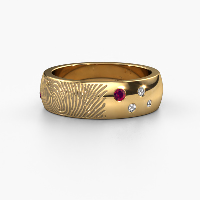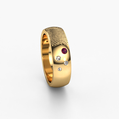 What could be more unique than a fingerprint? That makes this unisex wedding ring with rhodolite special. A personal fingerprint of your loved one, engraved tot the symbol of your everlasting love. Wouldn't it be lovely to slide this modern wedding ring around the finger of your partner on your wedding day? How does it work? First you order the wedding ring after customizing it to your liking. Once your order is placed, you send us an e-mail with the fingerprint you would like to use. For further instructions on how to make a fingerprint, check our database at the bottom of this page. This Minke wedding ring has an ±0.24 in (6 mm) width. After ordering your wedding ring, our goldsmith will start creating your wedding ring immediately. Did you know we use the latest modern techniques, combined with ancient craftsmanship? This helps to create a 3D design of your jewel. You can order a dummy ring, if you please. This way you can check if the wedding ring meets your standard. Then, our goldsmith, who strives for perfection, will create your ring in our own artisan studio completely by hand. We feel passionate creating a unique ring each time. One which is finished to perfection. In the end, you get a wedding ring which matches your wishes.By the way, you can be inspired by this wedding ring and have it further adjusted to your taste. Do you prefer a smaller band or a wider one? Do you prefer a shiny ring or a matte one? Anything is possible. Also, if you have an idea of your own for extraordinary wedding rings, or if you have seen a beautiful set somewhere else that you really like and would like to have adjusted to your personal taste: no problem! don't hesitate to contact us. Our designers will gladly discuss your possibilities with you!Because we design and deliver our own wedding rings, we can offer you wedding rings at a price you won't find anywhere else. A ring is made to order, which helps prevent excess supplies, so we can make you a great price offer.To make it easier for you, we offer a 30 day return policy. Check our terms and conditions.