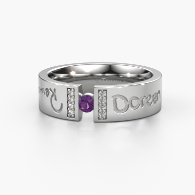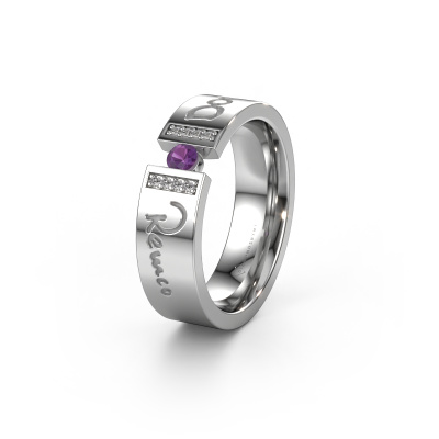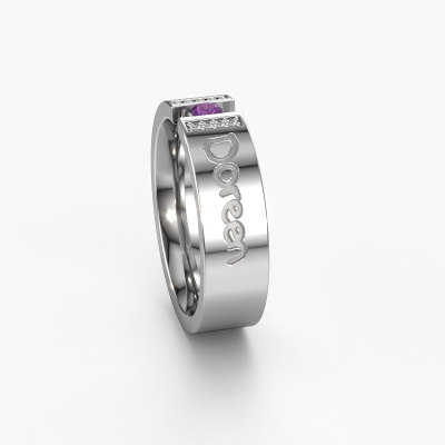 A unique wedding ring with amethyst! What makes this ladies wedding ring WH2094L16C special, is that you can have it engraved with a special text, which has meaning to you. A word, a short phrase or part of the lyrics to a song. Whichever text is most meaningful to you. Memorialize it as an exquisite engravement on this modern wedding ring. This own Text ladies wedding ring has an ±0.24 in (6 mm) width. You can choose the combination of precious metals of your preference in our online tool. Anything goes! It is wise to browse through the characteristics of each different precious metal. For example, gold and silver are softer metals. Carat is determined by the amount of added extra metals. If the goldsmith doesn't add a lot, carat is higher and the wedding ring will be softer. If he adds more metals, the jewel has a lower amount of carat. A softer precious metal can still be used for your modern wedding ring! If you prefer a precious metal which will last a lifetime, we recommend platinum. This is the most solid and durable metal our goldsmith uses.This wedding ring can also serve as a source of inspiration. Would you like the ring to have a matte or shiny finish (at no additional cost), or would you prefer it to be wider or narrower? Anything is possible. Because there are countless variations, we can’t show everything on our website. Do you have an idea for beautiful wedding rings, or have you seen a stunning set of wedding rings elsewhere? Feel free to contact us; our designers are ready to assist you.By combining our modern techniques with ancient crafting, we can design and customize the finest quality jewels with the utmost care for you at the best price. Our wedding rings are always priced 30% lower than those of other jewelers. We make wedding rings to order so we don't have to maintain a large stock.To make it easier for you, we offer a 30 day return policy. Check our terms and conditions.