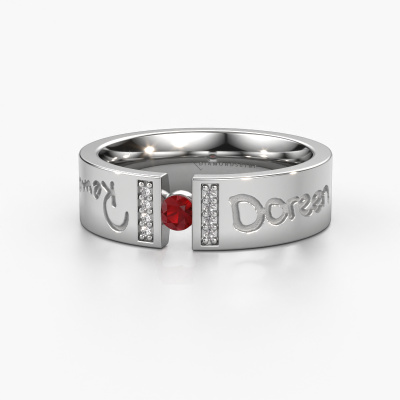 A unique wedding ring with ruby! What makes this ladies wedding ring WH2094L16C special, is that you can have it engraved with a special text, which has meaning to you. A word, a short phrase or part of the lyrics to a song. Whichever text is most meaningful to you. Memorialize it as an exquisite engravement on this modern wedding ring. This own Text ladies wedding ring has an ±0.24 in (6 mm) width. You can choose the combination of precious metals of your preference in our online tool. Anything goes! It is wise to browse through the characteristics of each different precious metal. For example, gold and silver are softer metals. Carat is determined by the amount of added extra metals. If the goldsmith doesn't add a lot, carat is higher and the wedding ring will be softer. If he adds more metals, the jewel has a lower amount of carat. A softer precious metal can still be used for your modern wedding ring! If you prefer a precious metal which will last a lifetime, we recommend platinum. This is the most solid and durable metal our goldsmith uses.This wedding ring can also serve as a source of inspiration. Would you like the ring to have a matte or shiny finish (at no additional cost), or would you prefer it to be wider or narrower? Anything is possible. Because there are countless variations, we can’t show everything on our website. Do you have an idea for beautiful wedding rings, or have you seen a stunning set of wedding rings elsewhere? Feel free to contact us; our designers are ready to assist you.By combining our modern techniques with ancient crafting, we can design and customize the finest quality jewels with the utmost care for you at the best price. Our wedding rings are always priced 30% lower than those of other jewelers. We make wedding rings to order so we don't have to maintain a large stock.To make it easier for you, we offer a 30 day return policy. Check our terms and conditions.