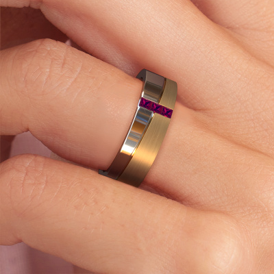 A unique two-tone white gold ladies wedding ring, designed by you, and then artfully crafted by our goldsmith in our own artisan studio! A beautiful symbol, reflecting your love, which you carry with you for a lifetime! Each ring we offer is artfully forged by hand in our own crafting studio. This makes it possible for us to create you a ring which is customized to your liking, completely mat/shiny your style. This modern WH0906L16A wedding ring is set with rhodolite, is ±0.24 in (6 mm) wide and has a mat/shiny finish. You can choose the combination of precious metals of your preference in our online tool. Anything goes! It is wise to browse through the characteristics of each different precious metal. For example, gold and silver are softer metals. Carat is determined by the amount of added extra metals. If the goldsmith doesn't add a lot, carat is higher and the wedding ring will be softer. If he adds more metals, the jewel has a lower amount of carat. A softer precious metal can still be used for your modern wedding ring! If you prefer a precious metal which will last a lifetime, we recommend platinum. This is the most solid and durable metal our goldsmith uses.Do you have special preferences regarding your wedding ring? For instance, a smaller or a wider band? Or perhaps a shiny or a matte ring? There are numerous variations possible. You can always discuss the possibilities with our jewelry designers. If you have certain wedding rings in mind, our designers will gladly help by drawing the rings of your dreams. Be sure to contact us!After receiving your order, our goldsmiths will start the creative process of making your wedding rings. We don't keep stock. This is advantageous because these costs will not be passed on to you. Therefore, our quality wedding rings are always priced 30 percent lower than those of other jewelers.To make it easier for you, we offer a 30 day return policy. Check our terms and conditions.