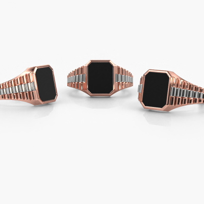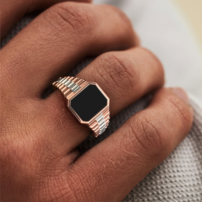 Everyone knows the design of this well-known watch brand. With two colors of rose gold links, this rectangular 14 Carat rose gold Brent 1 signet ring, is perfectly suited for trendy, successful men. A man who wants to dress to impress with a striking signet ring with 10x8 mm black enamel. Show them what you are made of!Customize your own royal Brent 1 signet ring, which will then be created by our goldsmiths with great passion. Do you prefer a different option than is shown here in the rose gold Brent 1 signet ring? Then our online tools offers various options. Feel free to ask us for help if you are unable to succeed. We are happy to answer your questions!New jewelry designs are added to our online collection daily. Our team of passionate designers strive to create extraordinary and diverse designs. Have you seen a ring you like? Please feel free to contact us. Based on a good price/ quality ratio, we will make you an offer you can't refuse!By using our modern techniques, we can design and customize the finest quality jewels with the utmost care for you. Our rings are always priced 30 percent lower than other jewelers. We make rings to order, so we don't have to maintain a large stock. If you have a certain budget, we are more than happy to advice you accordingly.To make it easier for you, we offer a 30 day return policy. Check our terms and conditions.